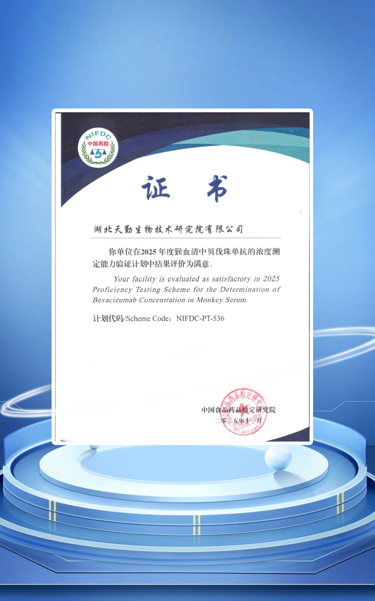 近日,天勤生物核心研發(fā)機(jī)構(gòu)天勤研究院(以下稱“天勤研究院”)在中國(guó)食品藥品檢定研究院(以下稱“中檢院”)組織開展的 “2025年度猴血清中貝伐珠單抗的濃度測(cè)定能力驗(yàn)證”(計(jì)劃代碼:NIFDC-PT-536)中,全部樣本檢測(cè)結(jié)果準(zhǔn)確,結(jié)果評(píng)價(jià)為 “滿意”。