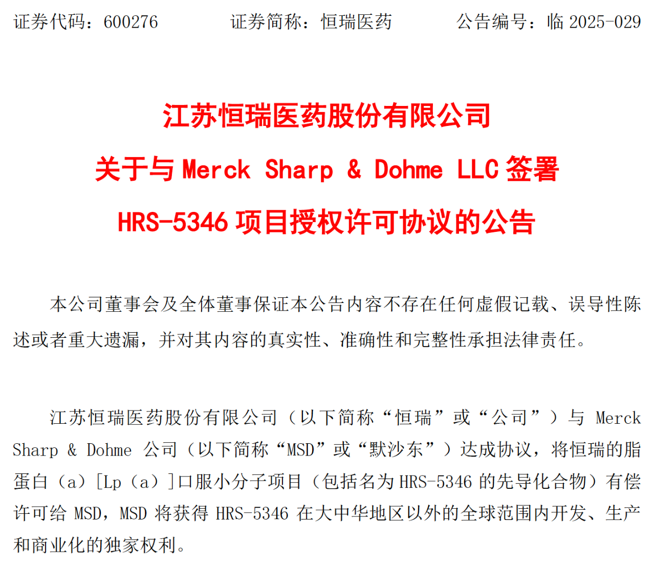 近日,恒瑞醫(yī)藥與全球醫(yī)藥巨頭默沙東就口服小分子Lp(a)抑制劑HRS-5346達成協(xié)議,該藥物在大中華區(qū)以外的全球開發(fā)、生產(chǎn)和商業(yè)化獨家權(quán)利已成功授權(quán)給跨國藥企默沙東,恒瑞醫(yī)藥將收取2億美元的首付款,并有資格獲得不超過17.7億美元的與特定的開發(fā)、監(jiān)管和商業(yè)化相關(guān)的里程碑付款,以及如果相關(guān)產(chǎn)品獲批上市,基于HRS-5346的凈銷售額的銷售提成。這標志著中國本土創(chuàng)新藥研發(fā)實力再次獲得國際認可。