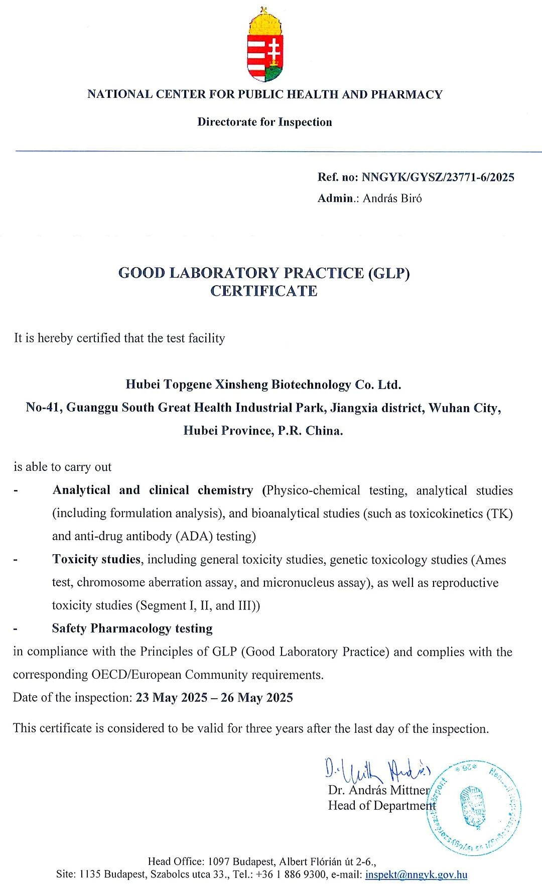 近日,湖北天勤鑫圣生物科技有限公司(以下簡(jiǎn)稱:“天勤鑫圣”)收到OECD成員國(guó)匈牙利國(guó)家公共衛(wèi)生和藥品中心(NNGYK)頒發(fā)的GLP證書(shū),認(rèn)證內(nèi)容包括“分析和臨床化學(xué)(包括制劑分析、生物分析如TK,ADA等)”、“毒性試驗(yàn)(包括一般毒性、遺傳毒性和生殖毒性等)”和“安全藥理學(xué)試驗(yàn)”。