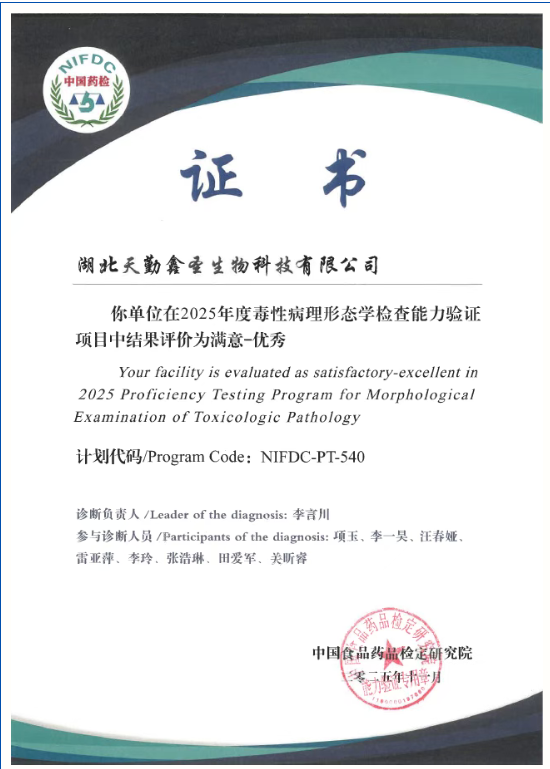 毒性病理形態(tài)學檢查是藥物臨床前毒理學評價的重要環(huán)節(jié)。為在毒性病理診斷領域持續(xù)保持高水平,天勤生物全資子公司湖北天勤鑫圣生物科技有限公司(以下稱“天勤鑫圣”)參加了由中國食品藥品檢定研究院組織的2025年度毒性病理形態(tài)學檢查能力驗證項目(NIFDC-PT-540),結(jié)果評價再次榮獲“優(yōu)秀”。